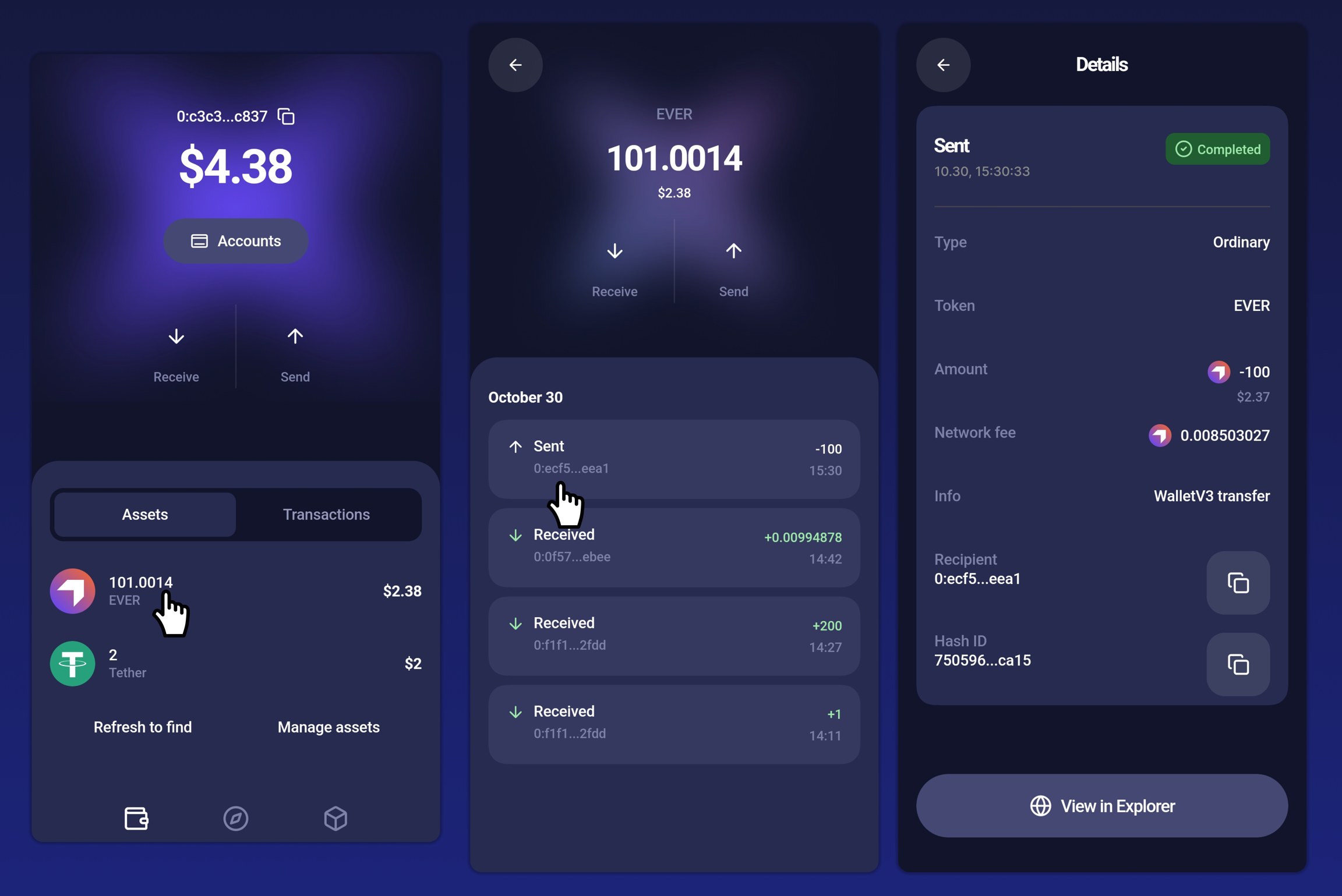 To see the transaction on the blockchain explorer, click Open in explorer to be directed to the full transaction page in the blockchain explorer.